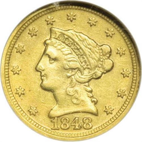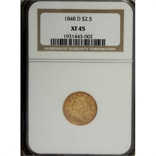 <B>1848-D $2 1/2 XF45 NGC.</B></I> Variety 10-M, one of only two die varieties known for the issue. This elusive Dahlonega issues has a meager production of 13,771 pieces. The stars, denticles, hair, and wings are richly detailed. Orange obverse toning conceals a couple of faint marks near the hairbun. <BR><BR><B>Coin Engraver:</B> Christian Gobrecht<BR><BR><b>Shipping:</b> Coins & Currency (<a target="_blank" href="http://www.heritageauctions.com/common/shipping.php">view shipping information</a>)