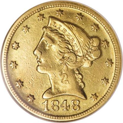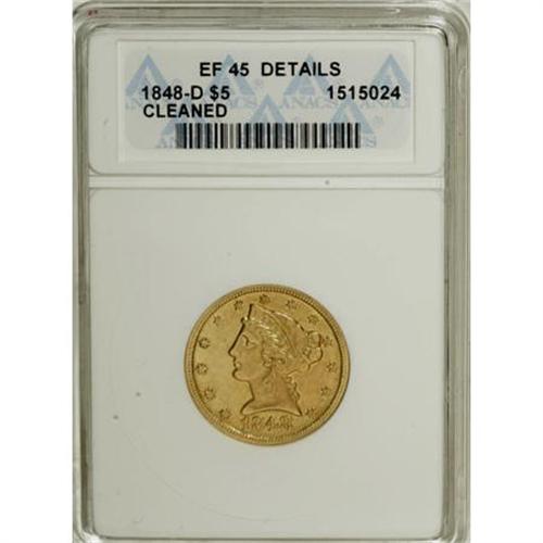 <B>1848-D $5 --Cleaned--ANACS. XF45 Details.</B></I> Variety 15-J. Die State I. A scarcer D-mint five and seldom seen any finer than XF. This particular coin does not show the obverse die cracks seen on later states. The surfaces are cleaner than usually seen, with the only mentionable mark a shallow scratch in the field in front of the arrow tips. Bright from cleaning. Well defined.<BR><BR><b>Shipping:</b> Coins & Currency (<a target="_blank" href="http://www.heritageauctions.com/common/shipping.php">view shipping information</a>)
