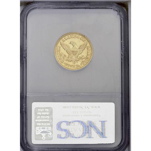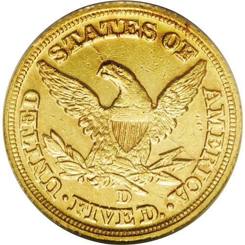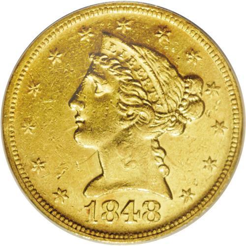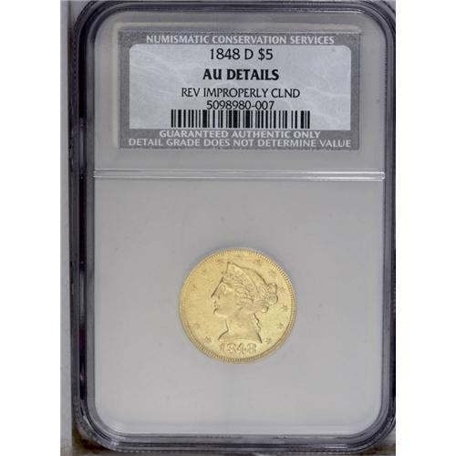 <B>1848-D<$5>--Reverse Improperly Cleaned--NCS. AU Details.</B></I> Variety 18-M. On this variety, the date is large and high, the second 8 is about the same distance between the neck and the denticles, and the upright of the mintmark is over the upright of the E in FIVE. Bright peach-gold surfaces display traces of luster in some of the protected areas. Fine hairlines are visible on the reverse, but do not seriously detract. The design elements are generally well defined, save for softness in the eagle's neck feathers. The '48-D is scarce in any grade.