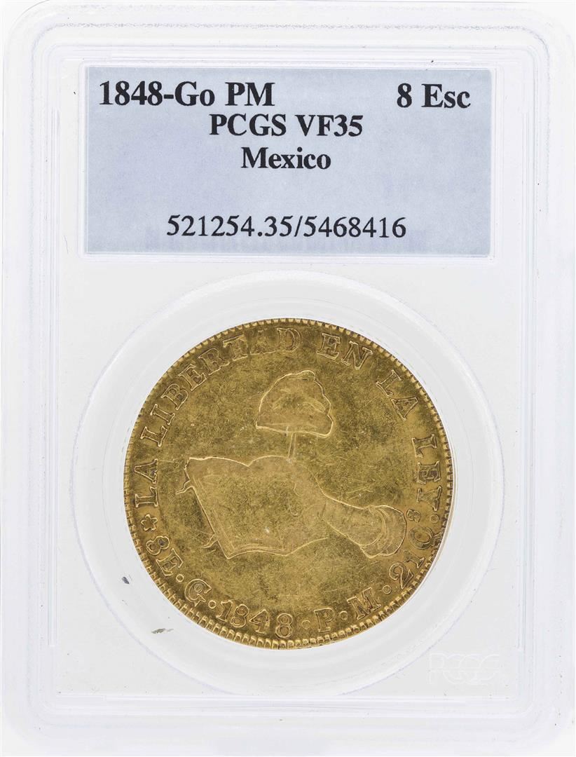 One 1848-Go PM Mexico 8 Escudos Gold Coin PCGS VF35. PCGS Graded.