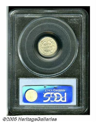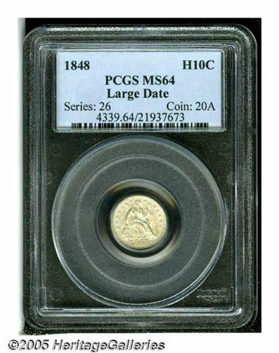 <B>1848<H10C> Large Date MS64 PCGS.</B></I> FS-001, Breen-3043. This variety was created when a Half Dime obverse die was accidentally impressed with a date logotype intended for the 1848 Dime. The top of the date overlaps the rock with the 1 almost touching the point of the shield. Both sides of this near-Gem are light golden-gray in appearance. All features are sharply struck with a bisecting reverse die crack (as struck) and die file marks (also as produced) at the CA in AMERICA. Usually in low grades. Population: 10 in 64, 3 finer (4/05).