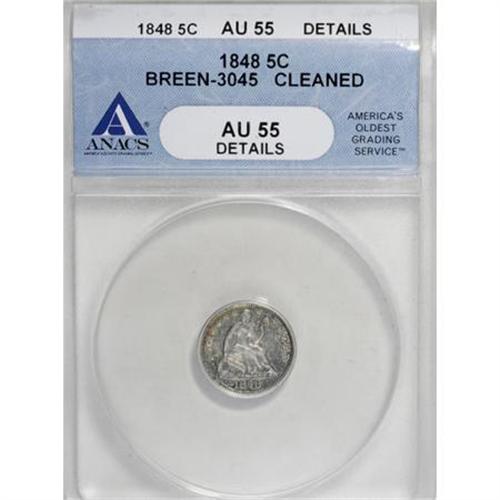 <B>1848 H10C Medium Date--Cleaned--ANACS AU55 Details.</B></I> Breen-3045. NGC Census: (7/61). PCGS Population (3/44). Mintage: 668,000. (#4338)<BR><I>From The Al Blythe Collection of Half Dimes.</B></I><BR><BR><B>Coin Engraver:</B> Christian Gobrecht<BR><BR><b>Shipping:</b> Coins & Currency (<a target="_blank" href="http://www.heritageauctions.com/common/shipping.php">view shipping information</a>)