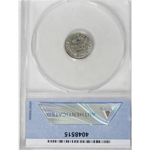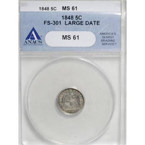 <B>1848 H10C Large Date MS61 ANACS.</B></I> FS-301, formerly FS-001. V-1. A dime logotype date punch was incorrectly used on the obverse die for this half dime. The date is too large to fit between the rock and dentils, and the upper portion overlaps the rock. Olive-gray and golden-brown with a sharp strike and a mark-free appearance.<BR><I>From The Al Blythe Collection of Half Dimes.</B></I><BR><BR><B>Coin Engraver:</B> Christian Gobrecht<BR><BR><b>Shipping:</b> Coins & Currency (<a target="_blank" href="http://www.heritageauctions.com/common/shipping.php">view shipping information</a>)