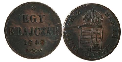 From the War of Independence, copper EGY (1) Krajczar. Kremnitz mint. Very solid piece with a couple of very minor rim nicks. Overall rainbow toning in hues of seafoam, blue & purple (no return).