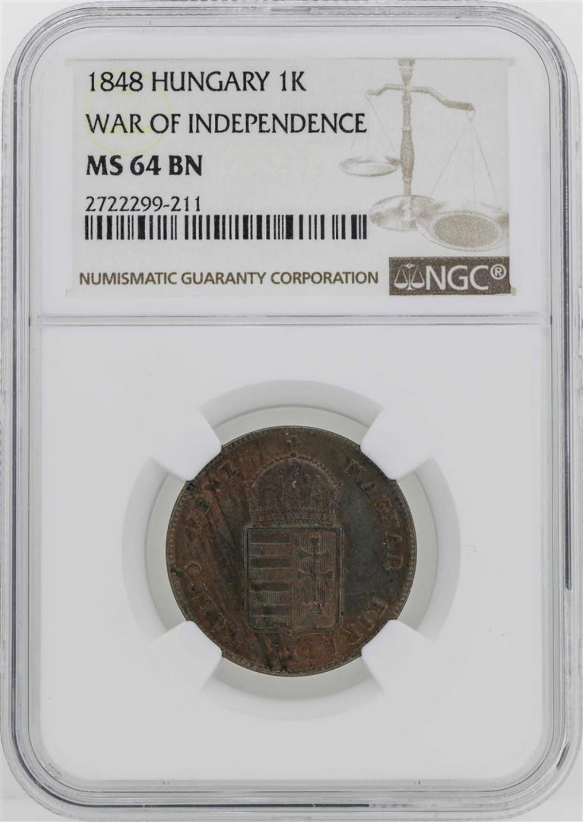 One 1848 Hungary War of Independece Kreuzer Coin NGC MS64. NGC Certified.
