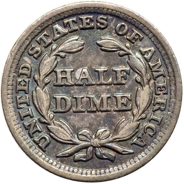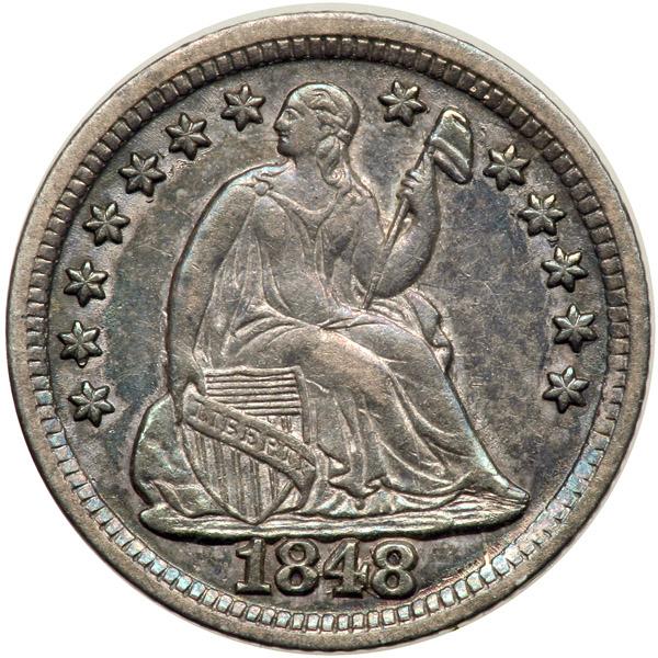 1848 Liberty Seated Half Dime. Large date. AU-50. Nice oldtime toning.