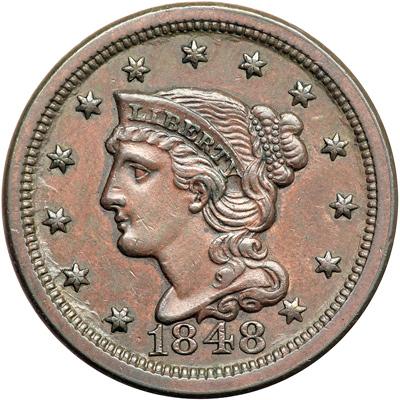 1848 N-15 R5-. EF-40. A bit sharper but lightly cleaned long ago and now retoned glossy chocolate and steel with slightly lighter toning in protected areas. No marks or other defects. The eye appeal is excellent. Sharply struck EDS, die state a, before any die cracks on the reverse. Tied for CC#8.