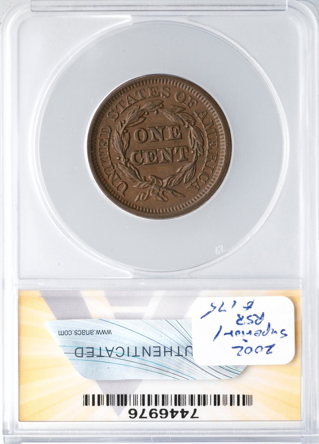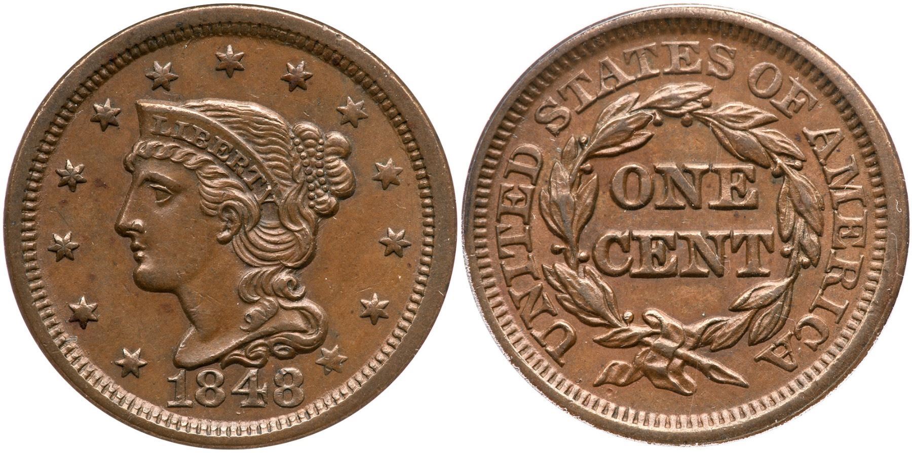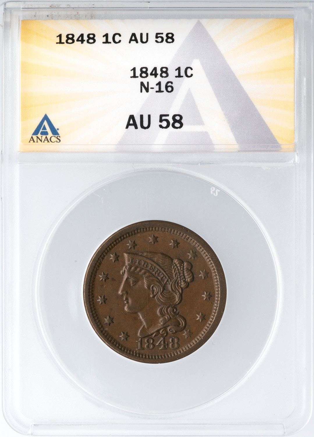 1848 N-16 R-2 ANACS AU58Attractive tan brown and light olive with a couple reddish chocolate brown toning spots in the left obverse field. There are a couple trivial marks on the jaw and neck visible under a glass, nothing distracting. Smooth surfaces. Very rare EDS with clear repunching at 184. Our grade is XF45+.Certificate Number: 7446976Pedigree: Ex; J.R. Grellman Collection 6/1999 - R.S. Brown Collection Superior 2000 - Dennis Fuoss