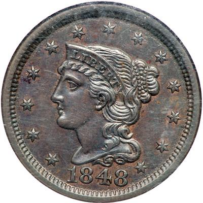 1848 N-17 R1. NGC graded MS-62 Brown. Repunched 4. Glossy olive and dark chocolate brown with traces of faded mint red remaining on the obverse and at least 10% of the reverse displaying faded mint color. The only mark is a tiny splash of slightly darker toning close under star 4. E-MDS, die state b. The repunching inside the triangle of the 4 is clear. Our grade is MS60. The attribution and Reiver provenance are noted on the NGC grading label.