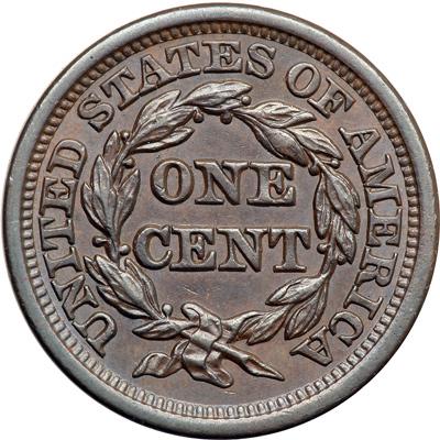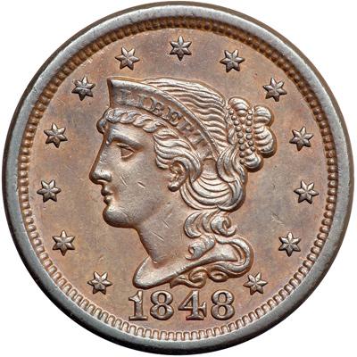 1848 N-17 R1. AU-50. Repunched 4. Frosty steel brown and chocolate. Close to AU55 but there are a few small nicks on the cheek and neck, none notable. Excellent eye appeal for the grade. E-MDS, die state b. The repunching on the 4 remains clear. Removed from an NGC slab graded AU58 (NGC label included, and it shows the attribution).