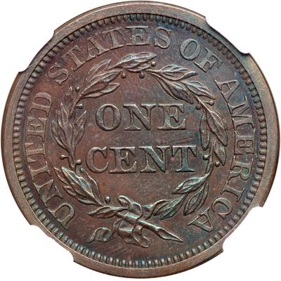 1848 N-19 R6-. NGC graded Proof 64 Brown. Dark bluish steel brown and chocolate with hints of very faded iridescent rose and violet from mellowed mint color. The strike is very sharp and the fields are nicely reflective in spite of a thin layer of natural oxidation. No spots, stains, or significant hairlines. However, there are a couple thin, faint vertical planchet creases passing down through ER in LIBERTY to near the ear, plus a very faint parallel one from the bottom of the hairbun into the field below where it fades out and a short one on the chin. These marks are all pre-striking planchet flaws that didn't completely press out and disappear when the coin was struck. The fine repunching just above the base of the 1 in the date is clear. Our grade is Proof-60. The attribution is noted on the NGC label. In a new NGC 4 pronged holder. Pop 1; 1 finer in PF66BN.