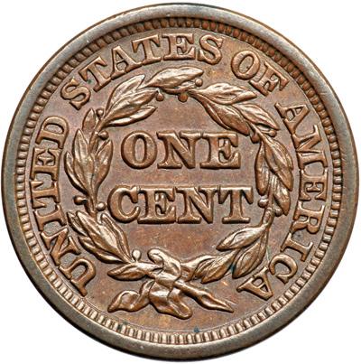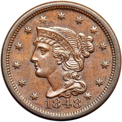 1848 N-20 R3-. MS-60. Repunched 48. Attractive frosty medium brown and light chocolate with subtle overtones of light bluish steel and tiny peeps of mint color remaining on the reverse. The only defect worthy of mention is a tiny but fresh nick in the dentils left of star 1. MDS, die state b. The tops of CE are joined by crumbling but the repunching on the 48 remains clear. The obverse fields are smooth and slightly reflective thanks to a fresh die lapping. Tied for CC#5 in the Grellman census.