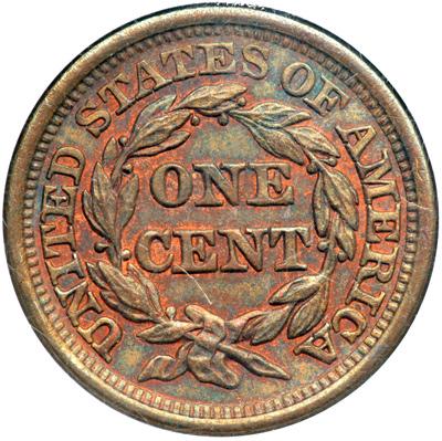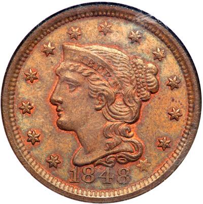 1848 N-22 R1. NGC graded MS-65 Brown. Light olive and golden brown with slightly darker bluish steel and olive toning covering the reverse. Slightly faded mint red covers 5% of the obverse, 15% of the reverse. The luster is subdued by a thin layer of oxidation that could easily be removed to expose the underlying mint frost, thus improving the eye appeal and grade. The only mark is a tiny speck of darker toning midway between stars 10 & 11. LDS, die state e, with a die line added through the top of the N in ONE. Our grade is MS62, tied for CC#2 overall but tied for finest of the late state in the Grellman census. The attribution is noted on the NGC label.