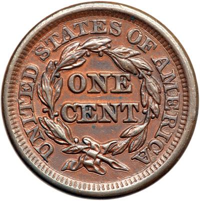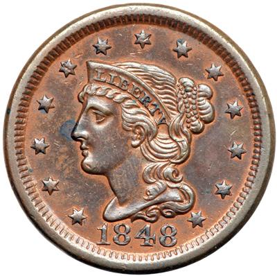 1848 N-24 R4. VF-35. Ten points sharper but recolored chocolate brown with lighter brown and tan in protected areas. A small splash of darker olive brown toning at the tip of the nose is the only distracting mark. LDS, die state c. The die line from the right top of the O in ONE is gone.