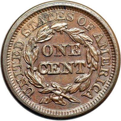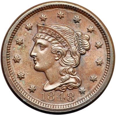 1848 N-25 R4. AU-58. Attractive lustrous steel brown and light chocolate with a couple faint peeps of faded mint red on the reverse. Very close to mint state. The notable marks are a tiny rim nick at star 13 and a small splash of bluish olive toning under star 2. LDS, die state c. The top of the 1 is crumbled to the bust above and the right foot of the M in AMERICA is crumbled to the leaf below. Tied for CC#5.