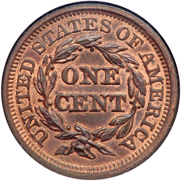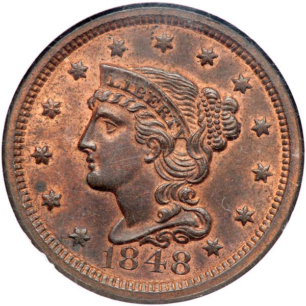 1848 N-25 R4. NGC graded MS-64 Red & Brown. Frosty olive and steel with at least a third of the bright original mint red remaining. Sharply struck and virtually flawless offering outstanding eye appeal. The only marks, and they are trivial, are a very faint horizontal hairline in the field between star 3 and the lips plus some tiny specks of dark bluish steel toning scattered over both sides, including one on the upper left of the C in CENT and another at the right top of the first A in AMERICA. Late die state, die state c, with extensive crumbling on the reverse and the top of the 1 in the date crumbled to the bust above. Our grade is MS63. CC#1 in the Grellman census by a good margin over a few pieces graded MS60 that display little if any mint color. This is a new discovery that should attract serious attention from advanced collectors.