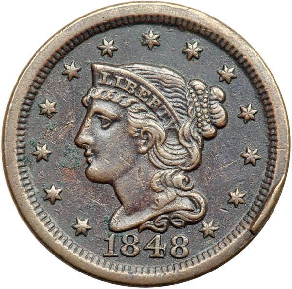 1848 N-27 R2 F15. Sharpness VF35 with small patches of light corrosion and verdigris in the field before the portrait and more on the reverse, mostly at UNITE and the wreath below. There are some light contact marks, including a few short hairline scratches in the obverse fields and a dull vertical nick under the earlobe. Mostly glossy dark chocolate and olive brown with medium brown highpoints. Extremely rare TDS, die state h, with a bold rim cud break at star 12. CC#2 of only 5 known with this rim cud, and the finest grades only VF20. Removed from an NCS slab graded AU details corroded (NCS label included, and it shows the attribution and Reiver provenance). DWH #2992.