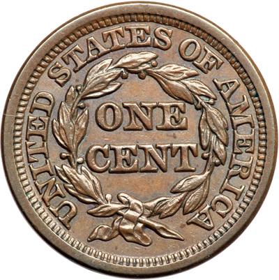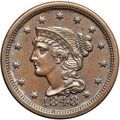 1848 N-3 R2. AU-50. Repunched Date. Choice glossy light to medium chocolate brown. Satiny mint luster covers the protected areas and this cent offers outstanding eye appeal for the grade. Just a few trivial contact marks from flawless. A tiny nick hidden in the hair left of the top of the ear is a good identifying mark. Nicely struck EDS, die state a. The repunching on the date is sharp and all the fine die finishing lines are clear.