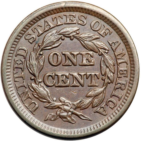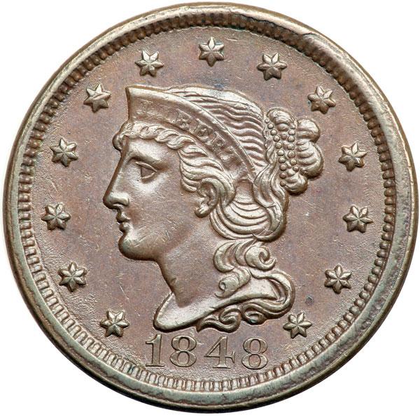 1848 N-30 R5+ AU50. Glossy medium steel brown with frosty mint luster covering the protected areas. Smooth and attractive with only trivial marks, including a tiny spot of darker toning over the right side of star 13 and a tiny planchet lamination on the rim over the E in STATES. MDS, die state b, with a rim cud break over star 8. Some of the fine obverse die lines are still visible but the ones at AME are gone. CC#2 for the variety in the Grellman census but finest known with the rim cud. Removed from an NGC slab graded MS64BN (NGC label included, and it shows the attribution and Reiver provenance). Comes with a great provenance. DWH #2994.