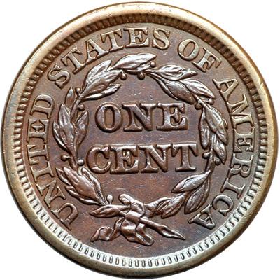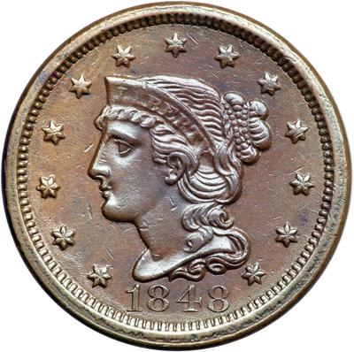 1848 N-30 R5. VF-35. Sharpness EF45 but lightly cleaned and nicely retoned glossy light chocolate brown. No spots or stains, just a few light contact marks. These include a vertical nick off the chin, a smaller diagonal nick in the field before the eye, and a dull nick on the rim at star 5. Very nice for the grade in spite of the retoning, perhaps closer to net EF40. Very rare EDS, die state a (Reiver's N-43), with fine die lines at stars 10-12 and AME. Tied for CC#5.