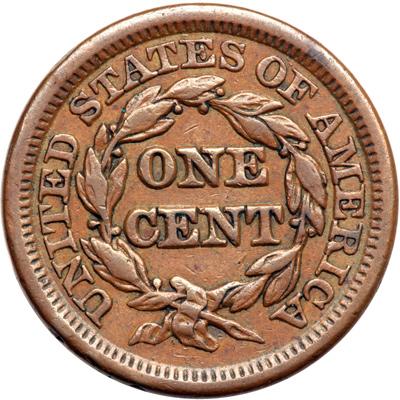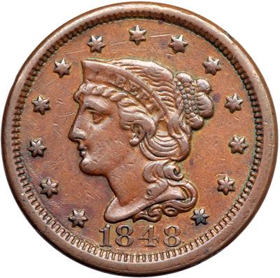 1848 N-30 R5. VF-20 Plus. Slightly sharper with some minor contact marks, including a dull, faint scratch that skips through stars 6-8 and a couple tiny rim bruises at the U in UNITED and ST in STATES. Attractive glossy medium brown. Very nice for the grade in spite of the minor marks. MDS, die state b. The die lines of the early state are gone but the rim cud over star 8 does not show. CC#8 in the Grellman census.