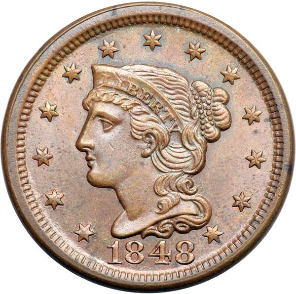 1848 N-31 R2+ MS62. Lustrous light steel brown with hints of bluish steel overtone and traces of mint red in protected areas, especially on the reverse. A speck of carbon in the field over the left side of N in ONE and another resting on the top of the C in CENT are the only notable defects. Great eye appeal for the grade. MDS, die state c, with two dentils fused over the left side of R in AMERICA. Removed from an NGC slab graded MS64BN (NGC label included). CC#8 in the Grellman census. DWH #2105.