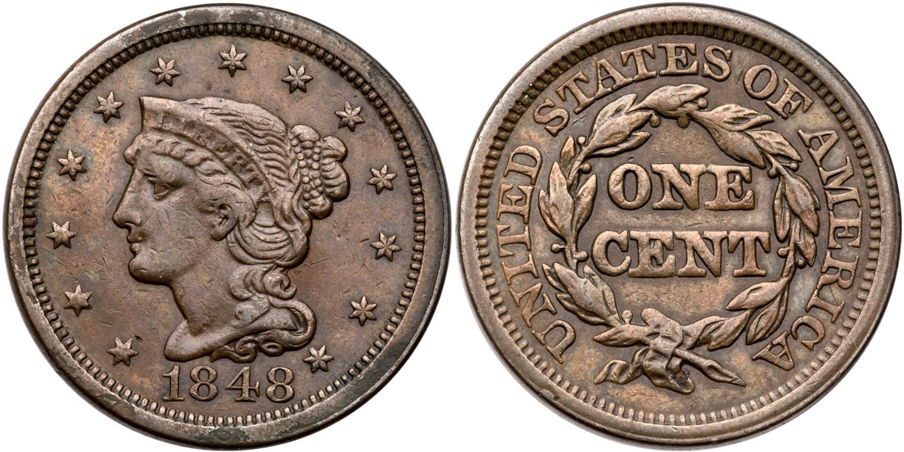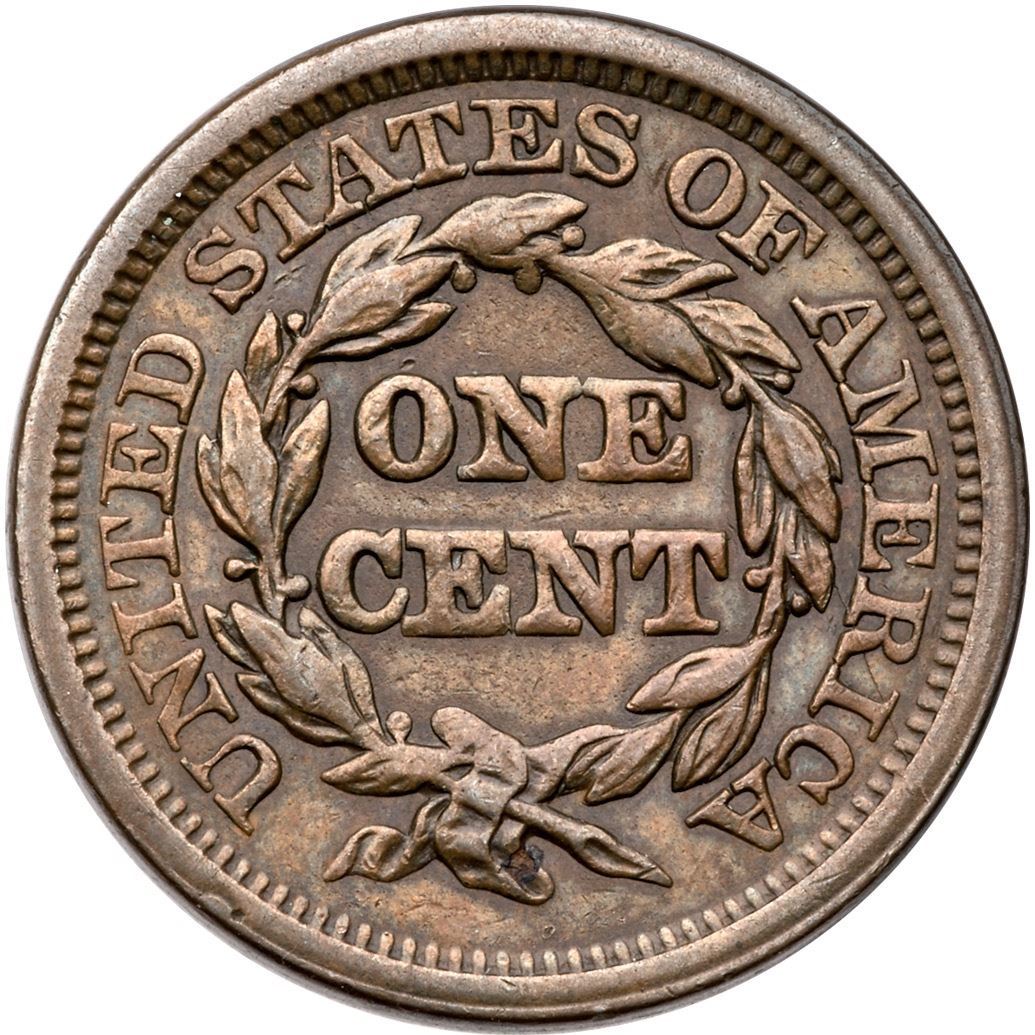 1848 N-32 R-5 VF20Glossy light olive and chocolate browns. There are traces of faint roughness in a few places on the obverse rim, otherwise the surfaces are smooth and attractive. No verdigris, and only a few minor marks. EDS, the die cracks on the reverse are light but visible, and parallel die lines show from the dentils at stars 11-13. Tied for CC#5 honors in the Grellman census.Certificate Number: Pedigree: Ex; Discovered by Allen Ross - Goldbergs 2/2017:715 - Phil Moore