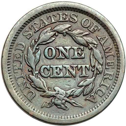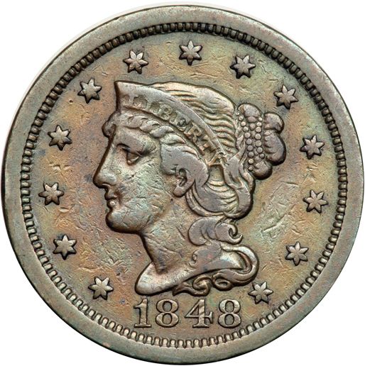 1848 N-32 R5 F12. Slightly sharper but recolored light bluish olive and steel brown. Smooth surfaces displaying only minor nicks. EDS.