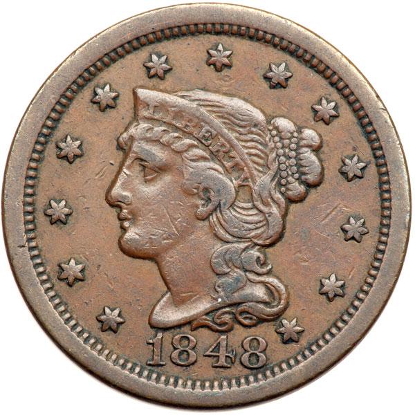 1848 N-32 R6- VF20. Glossy medium brown and chocolate. The surfaces are smooth and show only minor contact marks, including a few light nicks along the jawline and a tiny nick on the nose before the eye. MDS, die state a (there is no state b for this variety). The always-present reverse die cracks are obvious but not strong. A very nice example of this rare variety which seldom comes in grades better than Fine. Tied for CC#2 with one other piece in the Grellman census. DWH #2674.