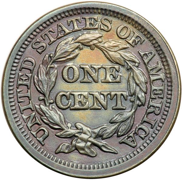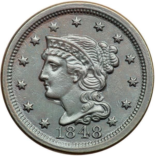 1848 N-36 R5 AU50. Mint state sharpness but the obverse is nicely recolored glossy dark steel brown and olive while the reverse is a less attractive glossy mix of reddish chocolate, light brown, and chocolate brown. No spots or contact marks. E-MDS, die state a. The die lines from the dentils into the obverse fields are still clear as those fields have become slightly rough. The head of Ms Liberty, including her ear and the hair around it, is a bit blunted, as always on this variety, but there is no apparent wear. Tied for CC#3 of this rare variety. Removed from an NCS slab graded Uncirculated details improperly cleaned (NCS label included, and it shows the attribution and Reiver provenance). DWH #2996.