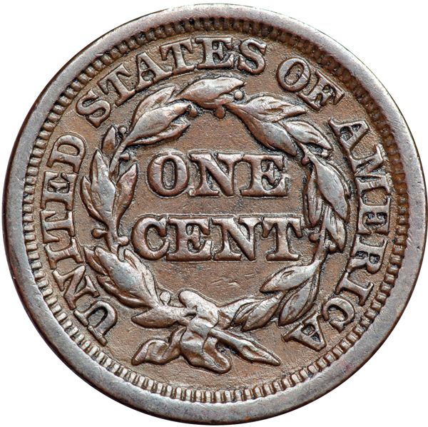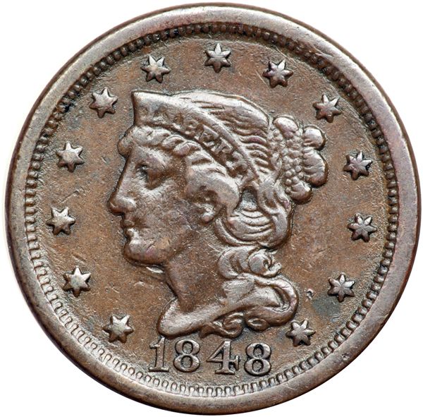 1848 N-36 R5- VF25+. Very attractive glossy medium chocolate brown. Smooth and quite nice for the grade, close to VF30. The best identifying mark is a small pinprick in the field left of star 12. EDS, die state a. Tied for CC#13 in the Grellman census.