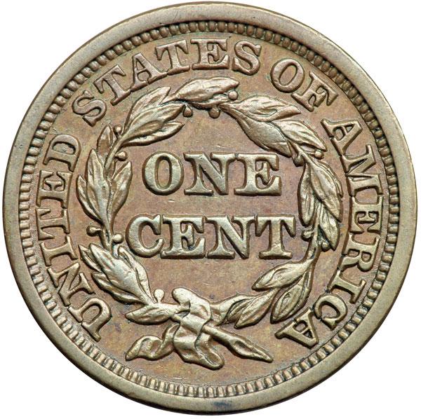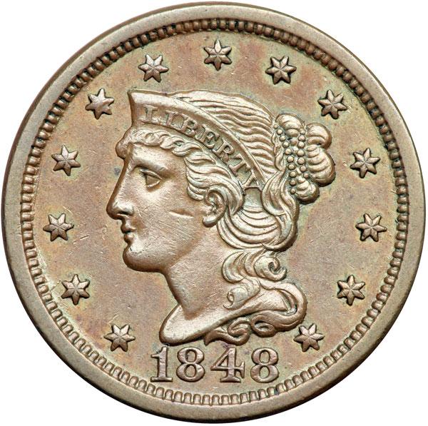 1848 N-37 R5- EF45. Five points sharper with a nick-like pre-striking planchet chip left of the earlobe and a small stain of dark olive toning on the rim under the ribbon loop. Glossy light brown with frosty tan in protected areas. Sharp EDS, die state a early, with all the fine die lines crisp (there is no state b for this variety). Tied for CC#4 in the Grellman census. DWH #2109.