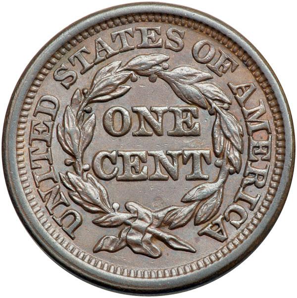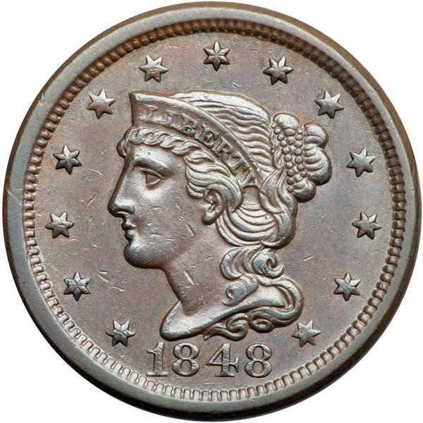 1848 N-38 R4- AU50. Frosty steel brown with traces of faded mint red on the reverse. A couple tiny ticks on the cheek and neck, none notable or distracting. E-MDS, die state a. There is a fine die line through the D to the berry under the adjacent S and the reverse is uncracked. Tied for CC#4 in the Grellman census. DWH #2110.