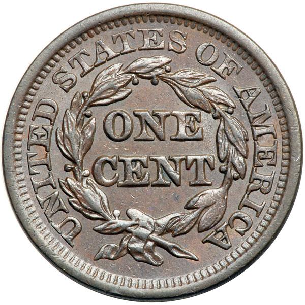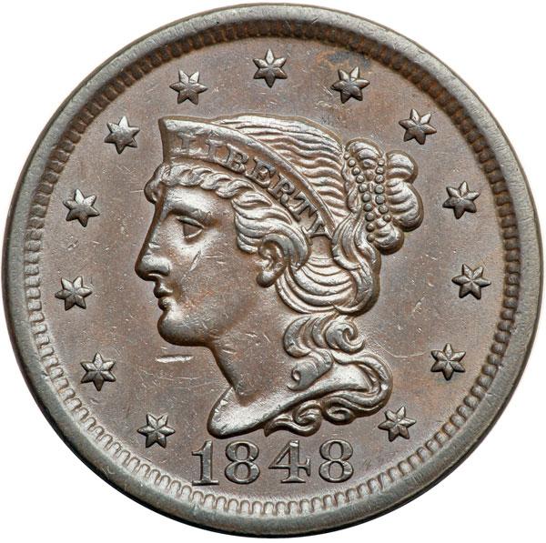 1848 N-39 R5+ EF45. Five points sharper with a few too many light marks on the obverse for the sharpness grade, including a horizontal nick in the field close under the chin. Frosty bluish steel brown with mint luster filling the protected areas. E-MDS, die state a. Fine die polishing lines show at the dentils over UNIT, but they are faint. There is no state b for this variety. CC#3 for this tough variety. DWH #2111.