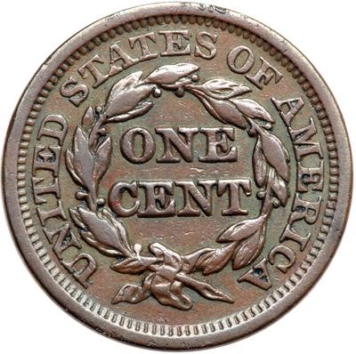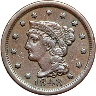 1848 N-39 R5. VF-20. Glossy chocolate and light olive brown. No roughness, only some tiny contact marks. These include a dull, light horizontal scrape in the field over the inner hairbun, some nicks between star 3 and the chin, and a collection of very tiny rim ticks over the second S in STATES. Otherwise this cent is very nice, close to VF25. Tied for CC#9.