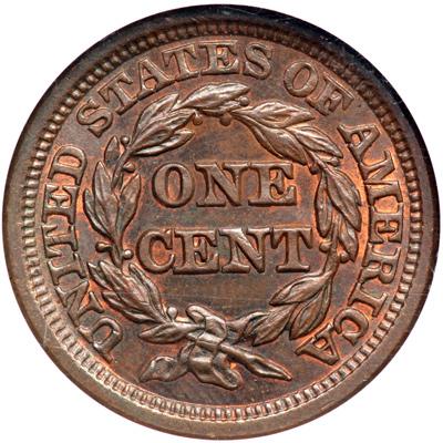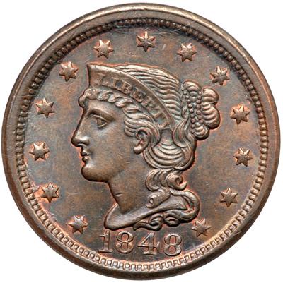 1848 N-41 R1. NGC graded MS-65 Brown. Lustrous light olive and bluish steel brown with traces of mint color showing on the obverse while 10% of the reverse shows mint red. Satiny mint frost covers the planchet and this cent offers excellent eye appeal. A tiny nick on the front edge of the neck and a faint diagonal hairline under star 2 are the best identifying marks. Scarce EDS, die state a, before crumbling forms on the left side of the second 8. Our grade is MS63, tied for CC#3 overall but finest of the early state in the Grellman census.