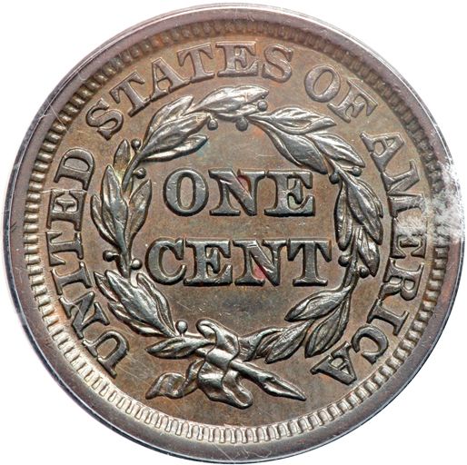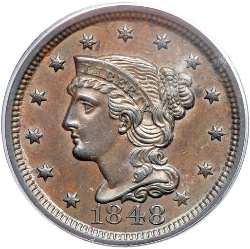 1848 N-41 R1. PCGS graded MS-64 Brown. Glossy olive and light chocolate with frosty lighter steel brown in protected areas. No notable defects, and the eye appeal is excellent. Just a touch of rub on the highest points from mint state. M-LDS, die state c. A dull horizontal spike has been added inside the bottom of the E in CENT. Our grade is AU55, tied for CC#20 in the Grellman census. The attribution and Naftzger provenance are noted on the PCGS label.