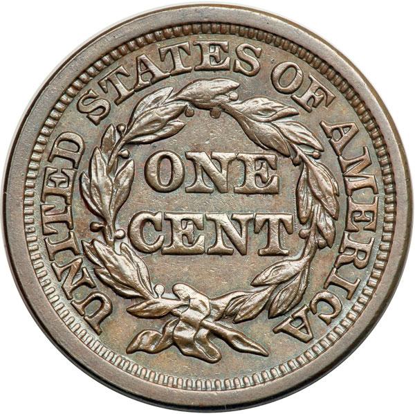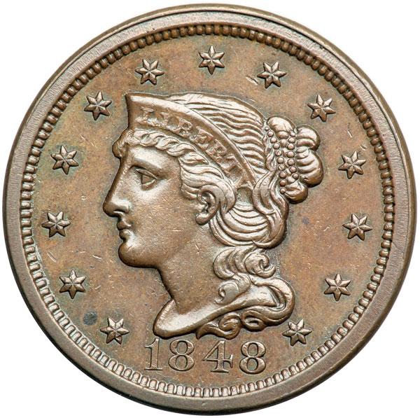 1848 N-42 R6 AU50. Glossy light steel brown, the reverse with delicate overtones of bluish steel and hints of faded mint red in protected areas. There is a small spot of darker olive toning left of star 1 and a tiny vertical nick on the chin, but overall this cent is very attractive with great eye appeal. EDS, die state a early (there is no state b for this variety). The fields are slightly reflective and show many fine die polishing lines. A choice cent, second finest of this rare die variety. DWH #2114.