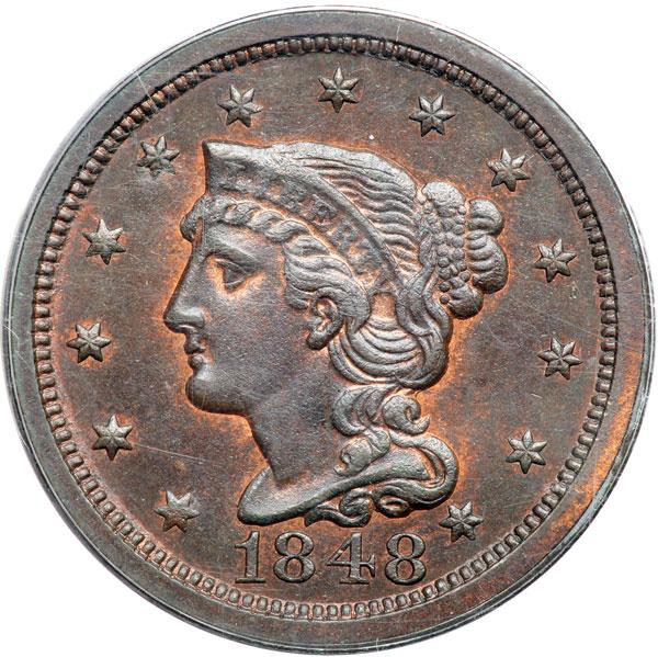 1848 N-44 R6-. PCGS graded MS-65 Brown. Frosty olive and bluish steel brown with faded mint red covering at least 10% of both sides. Satiny mint luster covers the planchet and the eye appeal is excellent. The best identifying marks are a subtle splash of slightly darker toning on the neck just left of the middle curl and a speck of planchet slag in the field near the dentils under the wreath. The fields are smooth while the devices are matte in texture giving this piece a cameo look when the light hits just right. The strike is soft on the coronet over LIB and a couple of the stars do not show all their radial lines, but overall the strike is decent. E-MDS, die state a. The die lines at UN are clear. Called MS62 and tied for CC#1 in the Noyes census, his photo #30508. Our grade is MS63, tied for CC#1 in the Grellman census. The next best example in both census lists grades only EF40. PCGS population 2; none finer. Only 2 graded at PCGS for the variety. DWH #3600 (PCGS # 406553) .