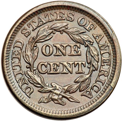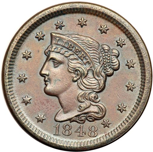 1848 N-6 R2 AU58. Very close to mint state but there are faint specks of reddish brown toning from an old fingerprint in the field between star 1 and the chin. Lustrous steel brown and chocolate with a tiny wisp of olive brown toning on the cheek. Scarce LDS, die state d. The die crack through MER is strong, the section of die outlined by this crack is shifted outward, and a tiny cud break rests on the left top of the M. Not in the overall condition census for the variety but one of the finest known of the late die state.