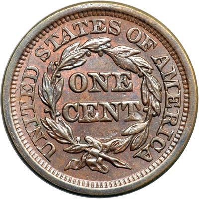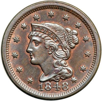 1848 N-8 R3-. MS-60 Plus. Lustrous light olive and chocolate brown with 10% of the planchet covered with slightly faded mint red. Excellent eye appeal with only a few barely visible contact marks. These include a tiny pinprick under star 8 and a few microscopic ticks between stars 9 & 10. Sharply struck LDS, die state f, with numerous fine die cracks around the reverse legend. A beautiful cent with choice eye appeal, CC#5 in the Grellman census. And it comes with a nice provenance.