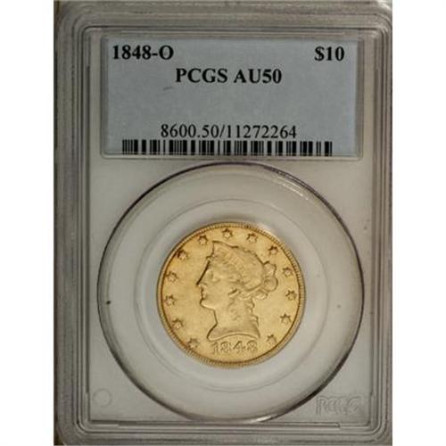 <B>1848-O $10 AU50 PCGS.</B></I> A delightful survivor from a mintage of just 35,850 coins. Although PCGS has certified 30 submissions at the various AU grades, the typical 1848-O eagle is in a lower grade. PCGS has certified 69 pieces in grades below AU50. Population: 7 in 50, 23 finer (12/07).<BR><BR><B>Coin Engraver:</B> Christian Gobrecht<BR><BR><b>Shipping:</b> Coins & Currency (<a target="_blank" href="http://www.heritageauctions.com/common/shipping.php">view shipping information</a>)
