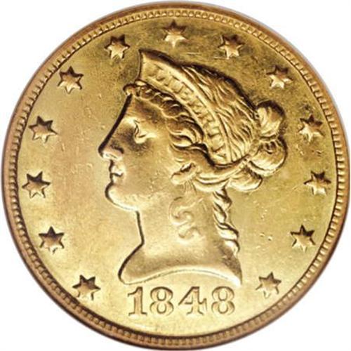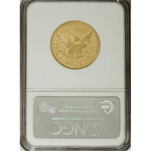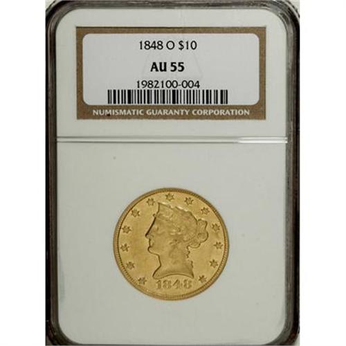 <B>1848-O $10 AU55 NGC.</B></I> A clean straw-gold example with only a single identifying mark, found beneath the T in UNITED. Pockets of luster illuminate design elements. The deeply hubbed stars have soft centers, but the eagle's wings and neck are precisely detailed. A scarce New Orleans issue. Census: 17 in 55, 20 finer (8/07).<BR><BR><B>Coin Engraver:</B> Christian Gobrecht<BR><BR><b>Shipping:</b> Coins & Currency (<a target="_blank" href="http://www.heritageauctions.com/common/shipping.php">view shipping information</a>)