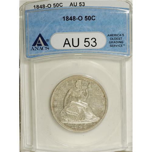 <B>1848-O 50C AU53 ANACS.</B></I> NGC Census: (1/52). PCGS Population (2/30). Mintage: 3,180,000. Numismedia Wsl. Price: $275. (#6261)<BR><BR><b>Shipping:</b> Coins & Currency (<a target="_blank" href="http://www.heritageauctions.com/common/shipping.php">view shipping information</a>)