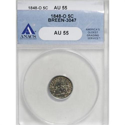 <B>1848-O H10C AU55 ANACS.</B></I> Breen-3047. Large O. Dusky sea-green, lavender, and olive-gold envelop this conditionally scarce half dime. A good strike despite minor weakness on HALF DIME. A mark is concealed beneath star 8.<BR><I>From The Al Blythe Collection of Half Dimes.</B></I><BR><BR><B>Coin Engraver:</B> Christian Gobrecht<BR><BR><b>Shipping:</b> Coins & Currency (<a target="_blank" href="http://www.heritageauctions.com/common/shipping.php">view shipping information</a>)