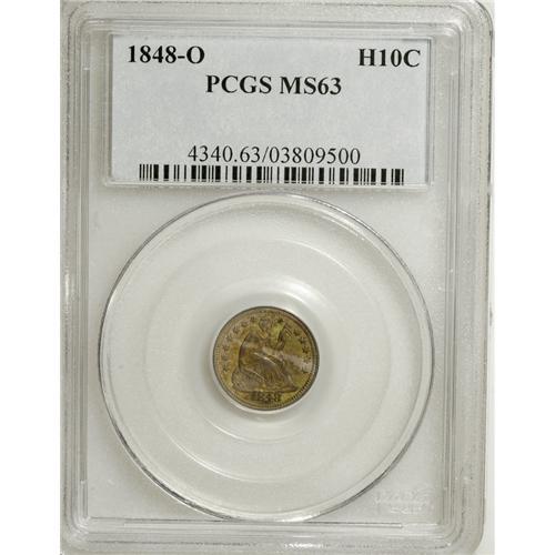 <B>1848-O H10C MS63 PCGS.</B></I> Medium O. A mixture of bright apple-green and pearl-gray toning adorns each side of this Select half dime. Several of the obverse stars are recut. Satiny and well struck without any objectionable marks.<BR><BR><b>Shipping:</b> Coins & Currency (<a target="_blank" href="http://www.heritageauctions.com/common/shipping.php">view shipping information</a>)