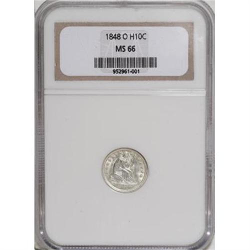 <B>1848-O H10C MS66 NGC.</B></I> Large O. A nearly brilliant Premium Gem that has a faint hint of tan toning near the borders. Lustrous, virtually immaculate, and well struck save for the A in HALF. Clashed from the stems and ribbons near Liberty's head. Rare in such exceptional quality. Census: 14 in 66, 2 finer (11/07).<BR><BR><B>Coin Engraver:</B> Christian Gobrecht<BR><BR><b>Shipping:</b> Coins & Currency (<a target="_blank" href="http://www.heritageauctions.com/common/shipping.php">view shipping information</a>)