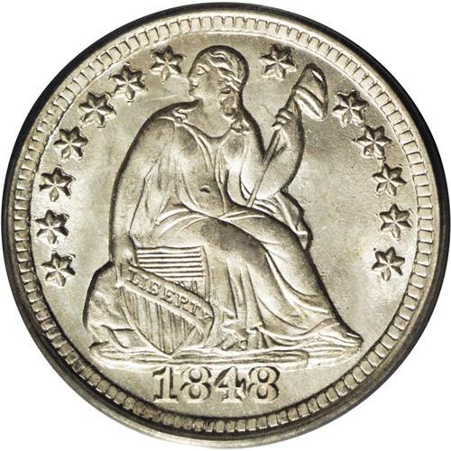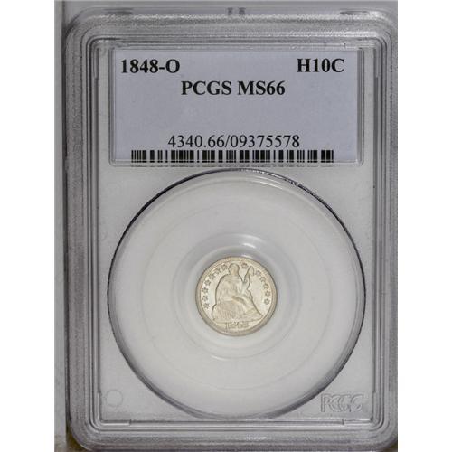 <B>1848-O<H10C> MS66 PCGS.</B></I> Bright and lustrous in the fields and desirable. The strike is bold on the obverse, although slight weakness is found at the center of the reverse. No signs of toning are present. Identifiable by a tiny nick on Liberty's tummy, and both dies show slight evidence of clashing. The date is punched too high, well up into the base of Liberty. Although not the absolute finest of the date, this one is very close and would make a welcome addition to any advanced date collection. Population: 6 in 66, 4 finer (3/06). <BR><BR><B>Important notice:</B> Heritage usually auctions material at the rate of 200-250 lots per hour. On some occasions eBay Live bid software or the Internet may not be able to keep up with the pace of the auction. We recommend placing a realistic absentee bid now as insurance to avoid disappointment. Occasionally the auctioneer may eliminate or reject an eBay Live bid, and the auctioneer may also reopen a lot after the close of the eBay live bidding (usually because we missed an audience bid), and may reject your bid even if it shows you as the winning bidder. By bidding via eBay Live, you agree that Heritage may award the lot to another bidder at its sole discretion under the circumstances described above or any other reasonable circumstances. Since eBay bids are not shown to us until we open the lot on the floor, we treat those bids just like floor bids. In most cases the floor responds before the eBay bid is presented to us, due to Internet lag time, so for consistency we have made it a policy that floor bids are always considered first over tie eBay live bids. Also please note that all Heritage lots purchased through eBay Live carry a 20% Buyer's Premium. Please make sure you read the Terms and Conditions before you bid. This lot is being auctioned in conjunction with a live floor auction by Heritage Galleries & Auctioneers. All final auction and invoice information will be supplied by Heritage Galleries & Auctioneers, and all other information should be considered preliminary. Lot:1886 <BR><BR><B>Winning Notification and Billing:</B> After the FINAL session in this auction is complete, Heritage will send e-mail and snail mail invoices. This process normally takes several days. All final auction and invoice information will be supplied by Heritage Galleries & Auctioneers, and all other information should be considered preliminary. <BR><BR>This auction will be conducted on a live auction floor and over the Internet through eBay Live. If you choose to place an absentee bid, please take a moment to <font color='#0000ff'><u><a href='http://pages.ebay.com/liveauctions/help/before/laabsentee.html'>learn how eBay Live absentee bidding works</a></u></font><font color='#000000'>