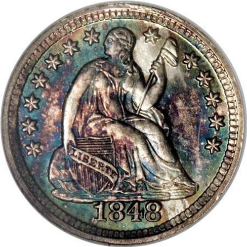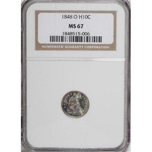 <B>1848-O H10C MS67 NGC.</B></I> Medium O. This variety is attributed by the gown pendant lined up just left of center of the 4, defects in star 5 and 6, and a bold date up against the base of the rock. A scarce variety and issue. Splashes of cobalt-blue and lavender rest over lustrous surfaces of this Superb Gem. Sharply struck, and well cared for. Census: 2 in 67, 0 finer (6/07).<BR><BR><B>Coin Engraver:</B> Christian Gobrecht<BR><BR><b>Shipping:</b> Coins & Currency (<a target="_blank" href="http://www.heritageauctions.com/common/shipping.php">view shipping information</a>\)