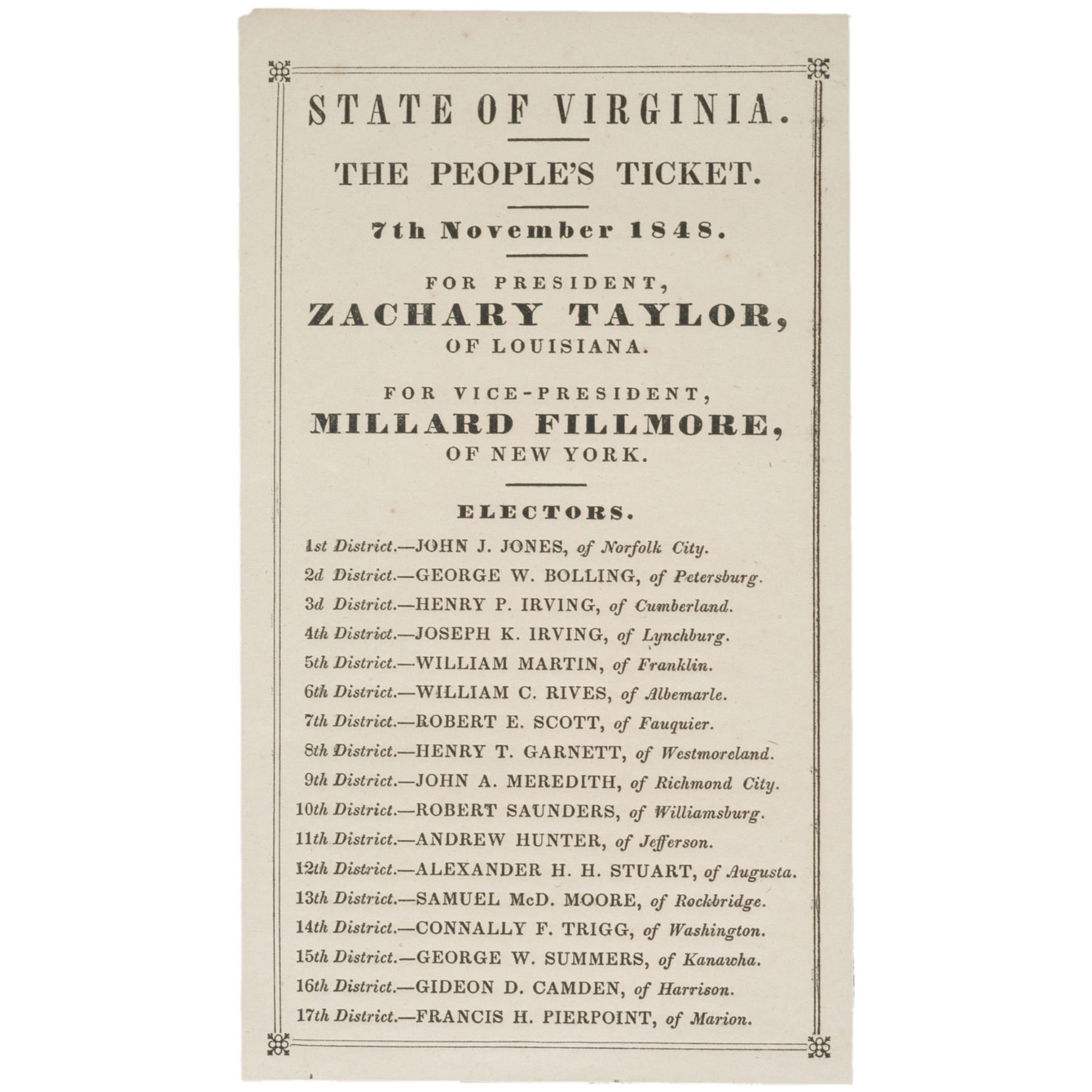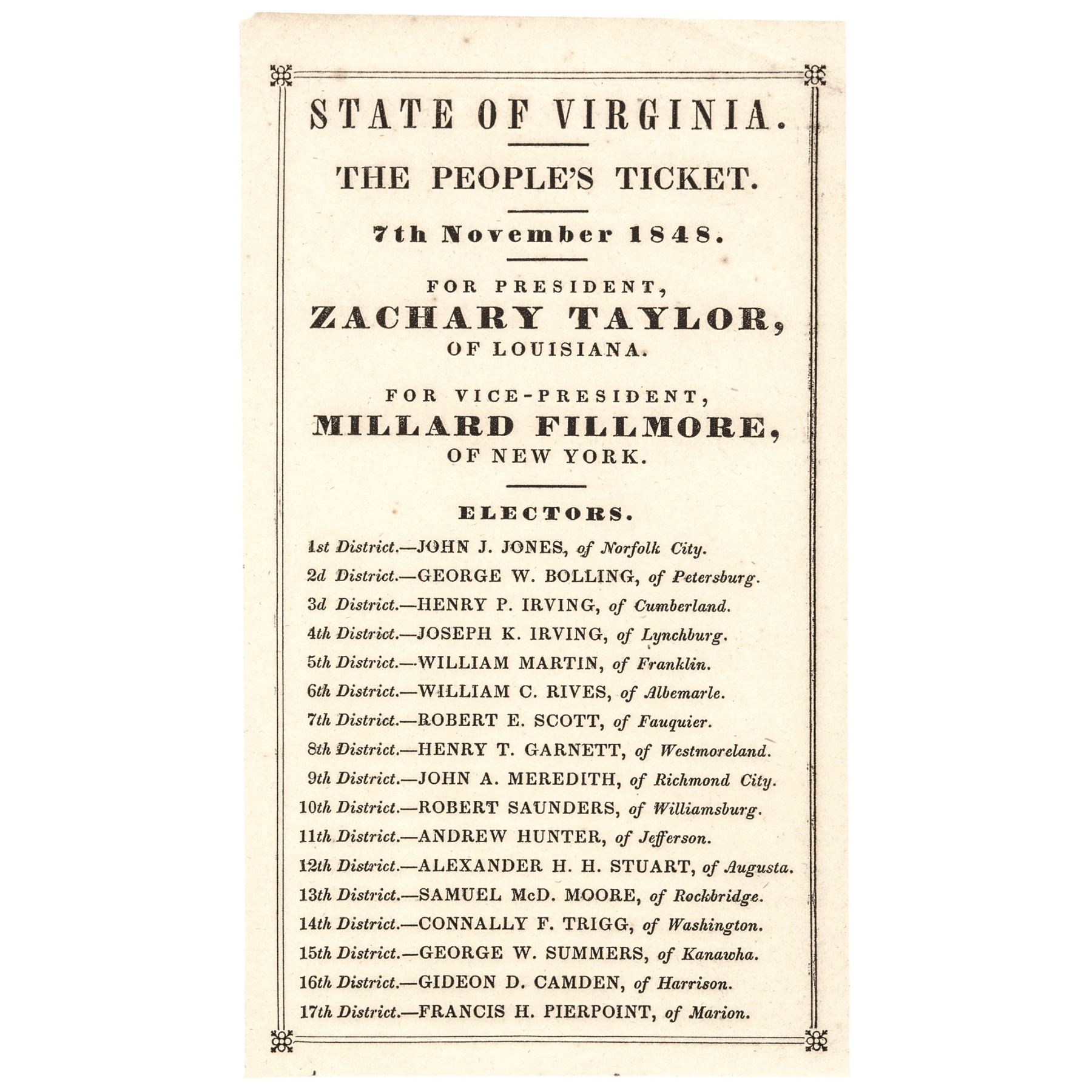 This Presidential Campaign Printed Ballot is for the “State of Virginia,” 6.5” x 3.75”, endorses Zachary Taylor for President and Millard Fillmore for Vice President. The ballot lists the 17 districts and their respective electors for the state. Very rare political item for the twelfth President of the United States.